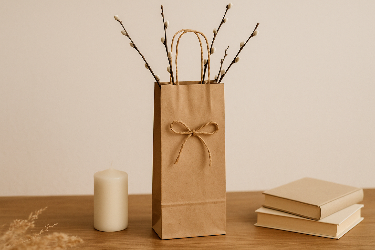 - Hnedá kraftová taška pôsobí prirodzene a hodí sa k vínu, olivovému oleju aj domácim produktom.