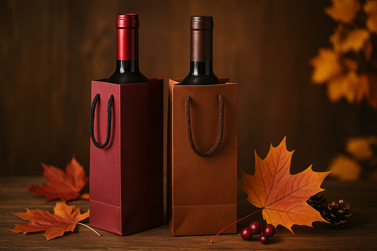 Na našom e-shope nájdete papierové tašky na víno v bordovej aj gaštanovej farbe, ktoré dodajú každej fľaši vína štýlový a sezónny nádych – a to bez vysokých nákladov.