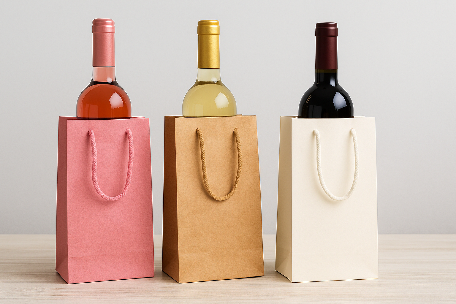 Na našom e-shope nájdete široký výber tašiek na víno – od prírodných kraftových, cez farebné a potlačené až po luxusné modely s metalickými detailmi. Či už balíte červené, biele alebo ružové víno, u nás si vyberiete tú pravú.