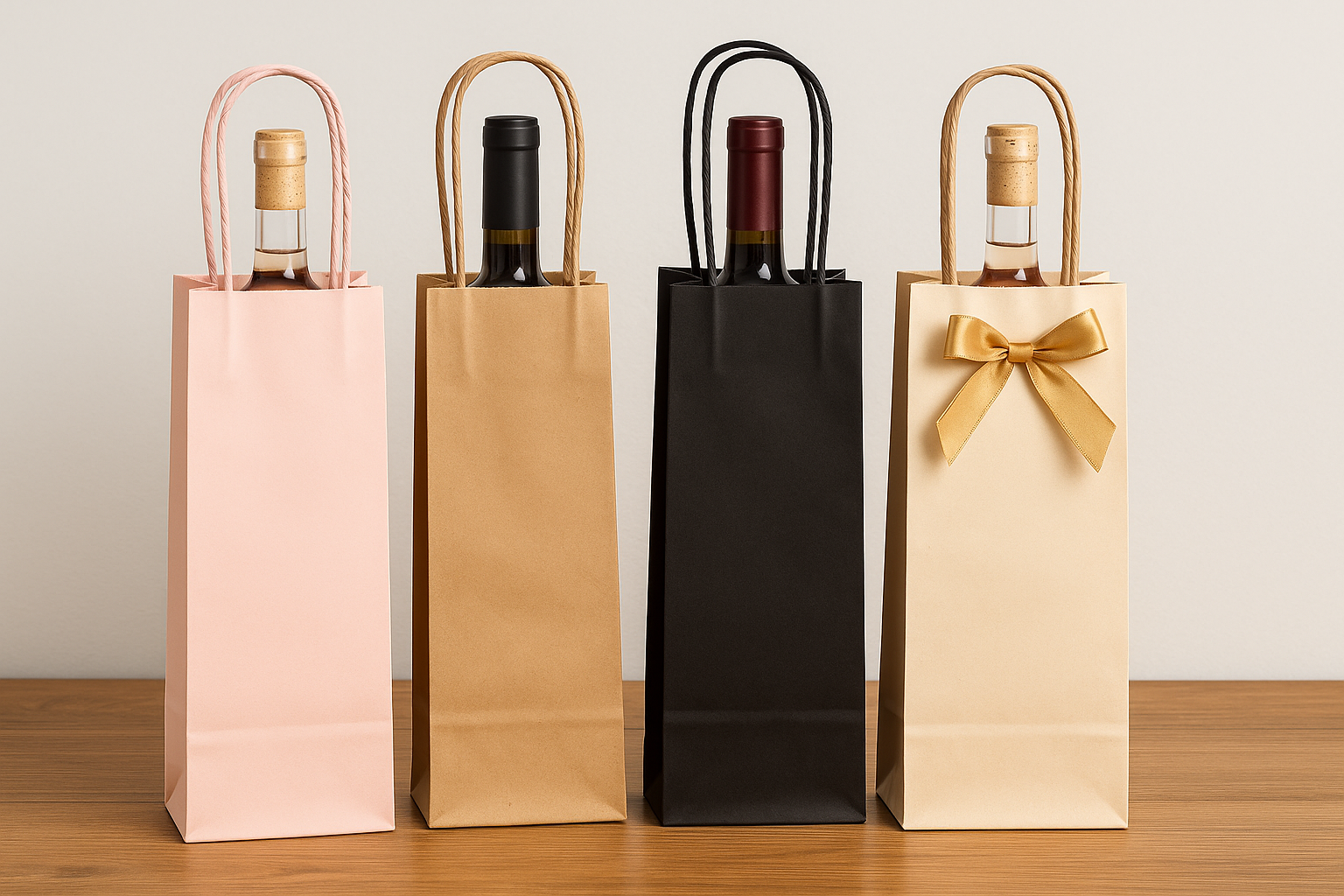 - širokú ponuku papierových tašiek na víno v rôznych farbách a veľkostiach,