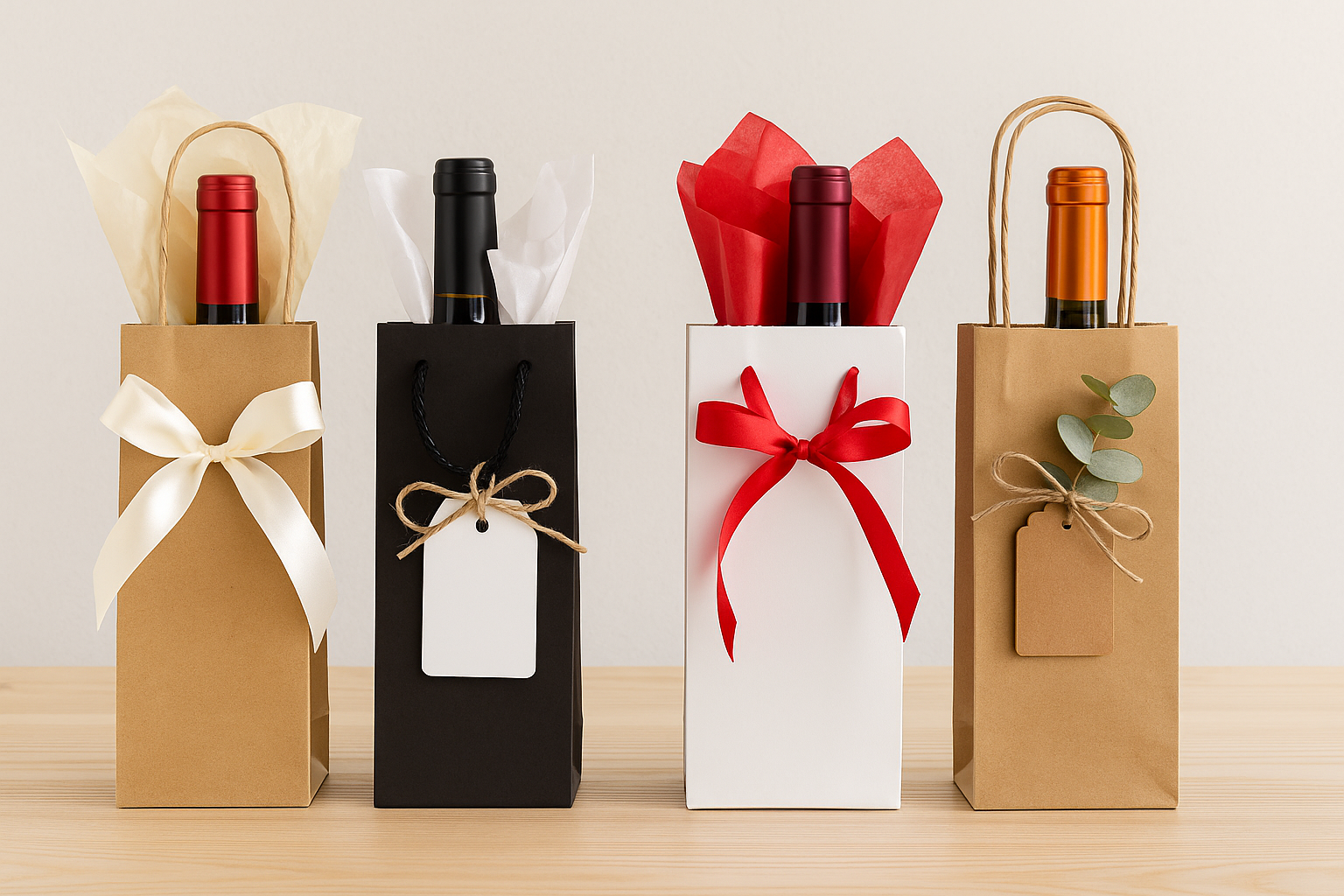 Taška by mala byť dostatočne silná, aby bezpečne udržala fľašu, a zároveň pohodlná na prenášanie. Najobľúbenejšie sú papierové tašky so skrúteným alebo plochým uchom, ktoré kombinujú funkčnosť a estetiku.